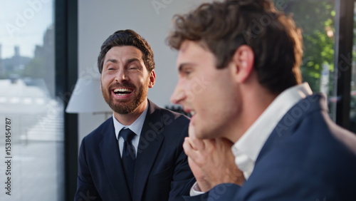 Excited coworkers discussing smartphone conversation hotel hall together closeup