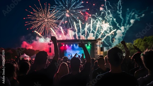 Excited Crowd Celebrating at a Music Festival, with Spectacular Fireworks Lighting Up the Night Sky, Capturing the Thrill and Energy of Live Entertainment