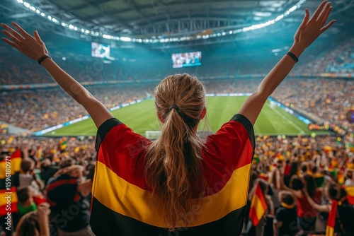 Excited football fans supporting the German national team at a live soccer match in a stadium, showcasing team spirit and enthusiasm for sports, Generative AI