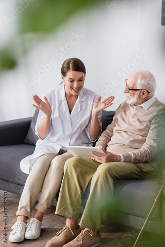 excited geriatric nurse sitting with open arms near elderly man and digital tablet on blurred foreground