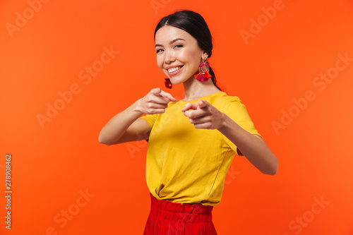 Excited happy young woman posing isolated over orange wall background pointing.