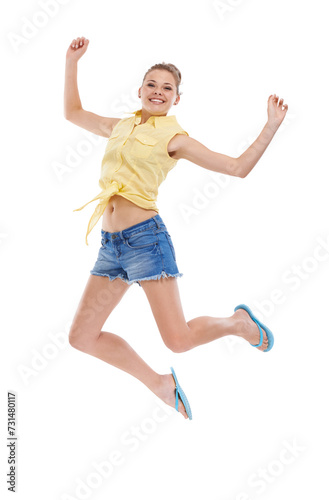 Excited, jump or portrait of girl teenager in studio for news, announcement or bonus prize. Energy, smile or happy model winner in celebration of fashion discount, success or sale on white background