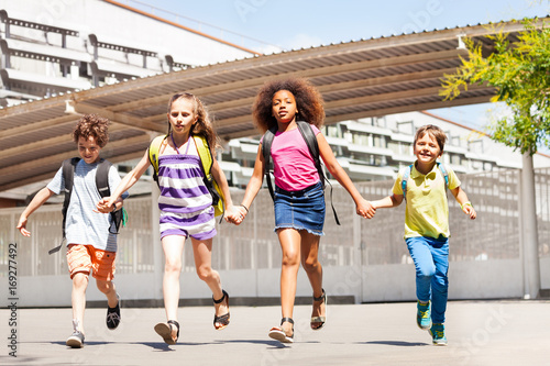 Excited kids run, hold hands near school building
