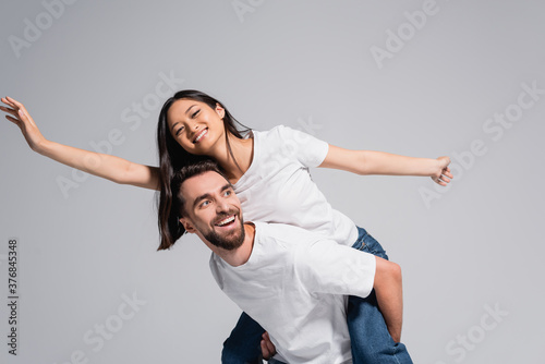 excited man in white t-shirt piggybacking asian girlfriend imitating flying isolated on grey
