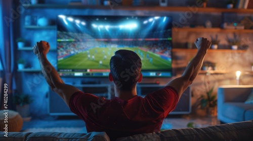 Excited man raising his fists in triumph as he watches a live soccer game on TV, emotional sports fan experience.