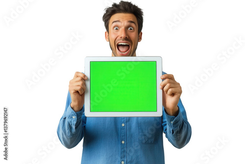 Excited man with a green screen tablet expressing joy in a bright atmosphere