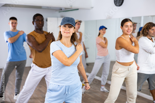 Excited sporty multiracial people practicing new movements steps during dancing training in studio