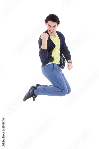 Excited successful man jumping of joy with proud expression