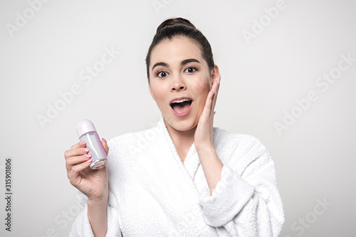 excited woman in bathrobe holding deodorant while looking at camera isolated on grey