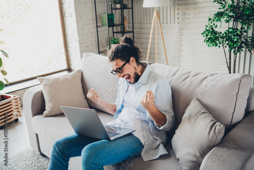 Excited young man celebrates online success while sitting on a comfortable sofa in a stylishly decorated living room during a bright day.