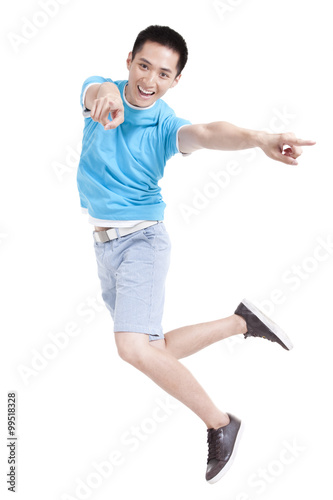 Excited young man jumping in mid air