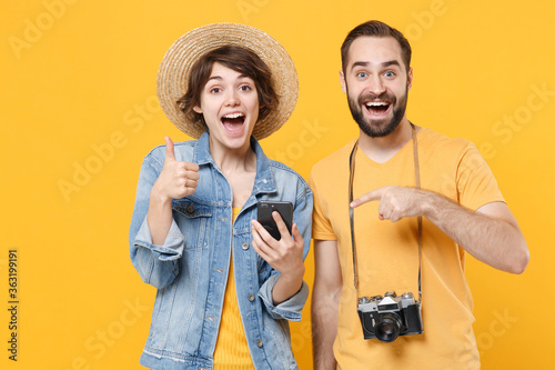 Excited young tourists couple friends guy girl isolated on yellow background. Passenger traveling abroad on weekends. Air flight journey concept. Point index fingers on mobile phone, showing thumb up.