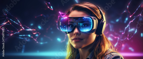 Excited young woman having virtual reality experience in neon light