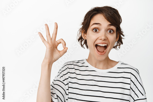 Excited young woman shows okay, ok excellent sign, approve and like somethning good, nod to like smth, standing over white background