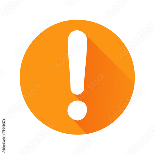 Exclamation mark in an orange circle, flat design icon with a modern long shadow effect
