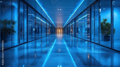 Exclusive Corridor Illuminated With Blue Lights in Modern Office Building. Generative AI