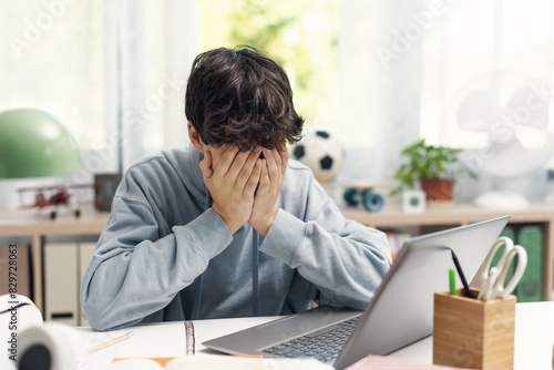Exhausted student resting with head in hands
