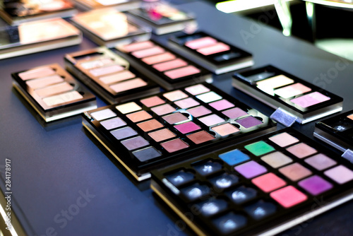 Exhibition of cosmetics in a boutique, eyeshadow on sale in a store. Colorful and gorgeous colors for professional makeup.