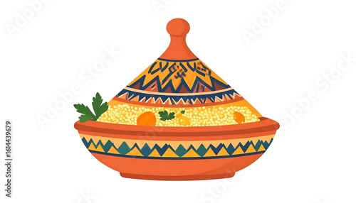 Exotic couscous dish in traditional tagine pot with intricate pattern details