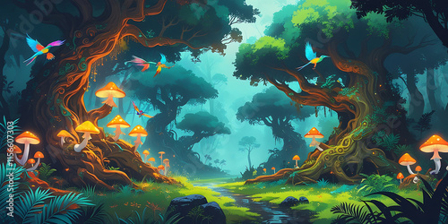 Exotic Forest with Strange and Beautiful mushroom. created by generative ai