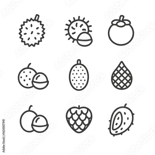 Exotic Fruit Icons. Outline icon set of exotic fruits: durian, rambutan, mangosteen, lychee, jackfruit, salak, longan, cherimoya,