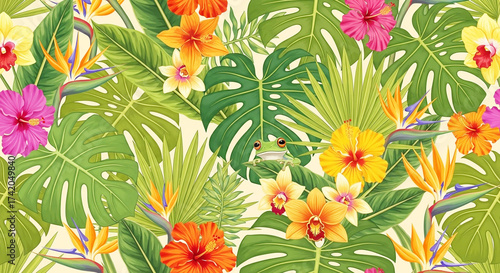 Exotic Tropical Seamless Pattern: Vibrant Flowers, Lush Leaves, and a Green Tree Frog Illustration