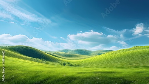 Expanse of green fields, valley of hills. Green hills, meadows under blue sky, panorama.