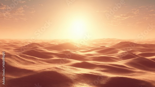 Expansive desert landscape with rolling sand dunes under a bright sun du sunset or sunrise, warm orange tones, tranquil natural scene