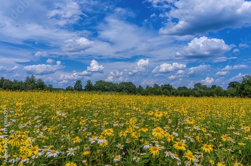 Expansive field of vibrant yellow flowers beneath a partly cloudy sky.