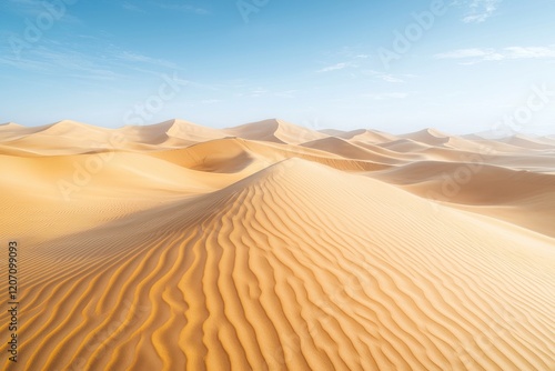 Expansive golden desert dunes stretch under a clear blue sky in a tranquil landscape of shifting sands and shadows