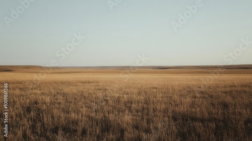 Expansive golden grasslands under a clear sky, evoking tranquility and openness.