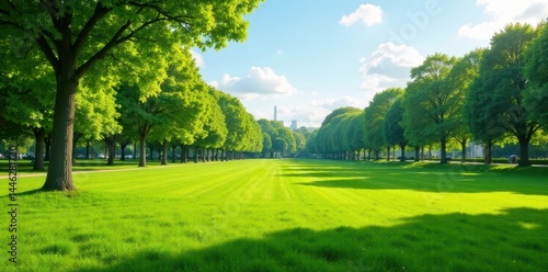 Expansive grassy expanse in vibrant public park, scenery, background