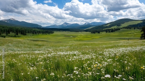 Expansive green field with blooming white wildflowers and mountains in the background under a blue sky : Generative AI