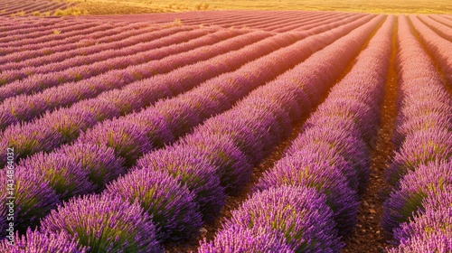 Expansive Lavender Field Under Golden Hour Light with Rows of Purple Blooms Stretching to the Horizon
