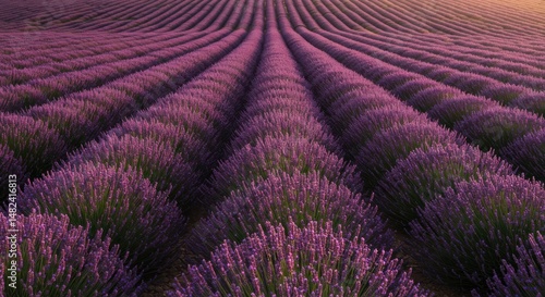 Expansive lavender fields in bloom at sunset, showcasing vibrant colors and patterns