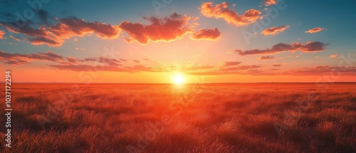 Expansive Prairie at Dusk, serene landscape unfolds under gentle sunset glow, horizon blending with soft hues of twilight