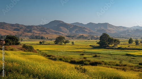 Expansive turmeric fields stretch into the horizon under golden sunlight with rolling hills