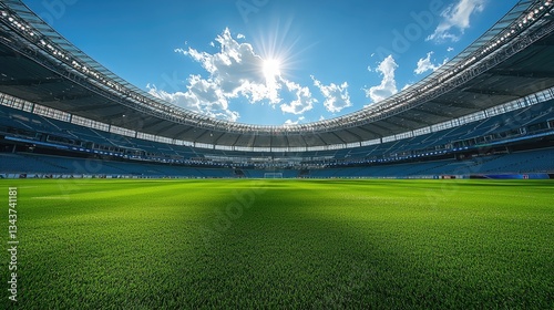 Expansive view of a sunlit stadium with lush green grass and clear blue sky