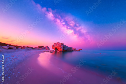 Expansive view of colorful cosmic landscape illuminated by stars and nebulae above serene ocean