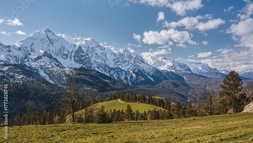 Expansive view of snow-draped mountains and lush greenery under a cloudy blue sky, highlighting seasonal change