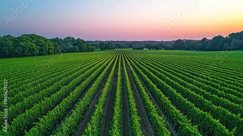 Expansive vineyard rows at sunrise. Lush green vines stretch across the landscape