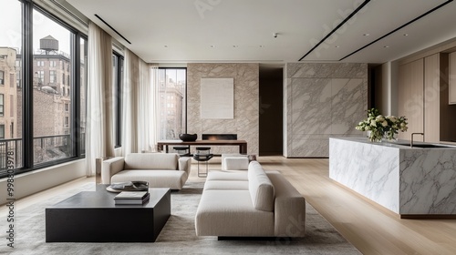 Expansive windows flood a modern apartment with daylight, illuminating a light luxury interior. Minimalist design reigns, with marble accents adding a touch of sophistication to the kitchen