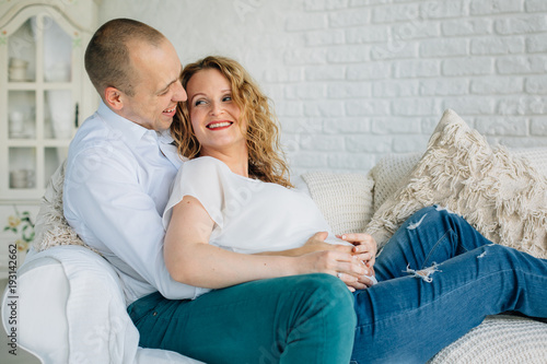 Expecting couple lying on couch in living room. Happy pregnancy concept