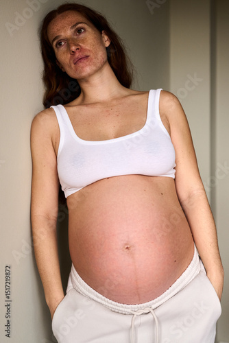 Expecting Mother Poses Indoors in Casual Attire