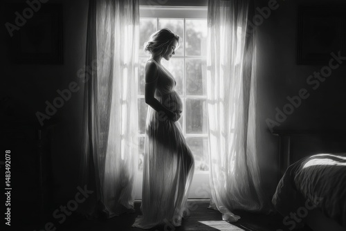 Expecting mother stands in front of the window in bedroom, monochrome photo, maternity, pregnancy, future motherhood, elegant, soft