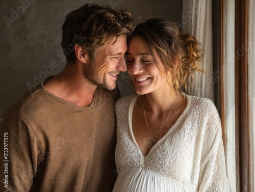 Expecting parents share a joyful moment in a cozy setting with warm light during pregnancy