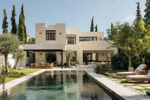Experience a sunny, contemporary villa featuring a sparkling pool and an inviting outdoor dining area, all nestled amidst lush greenery in a peaceful midday setting