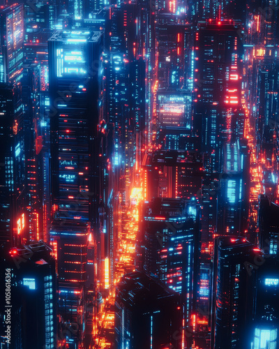 Experience a vibrant, high-tech cityscape filled with glowing neon lights and data networks. This futuristic urban landscape captures a dynamic atmosphere at night.