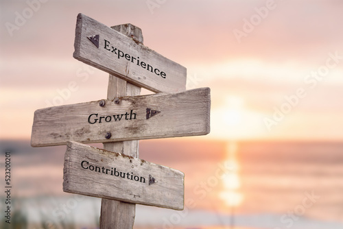 experience growth contribution text quote caption on wooden signpost outdoors at the beach during sunset.