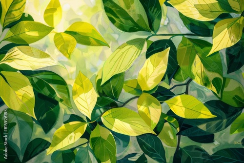 Experience the beauty of vibrant green leaves as they glisten in the sunlight, captured in this stunning illustration.